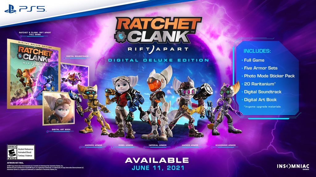 Beaucoup d’entre vous ont attendu patiemment de voir à quoi ressemblent les cinq armures incluses dans l’Édition deluxe numérique du jeu. Ces cinq apparences pour Ratchet et Rivet ont été spécialement conçues et développées pour l’Édition deluxe numérique. En voici un aperçu :