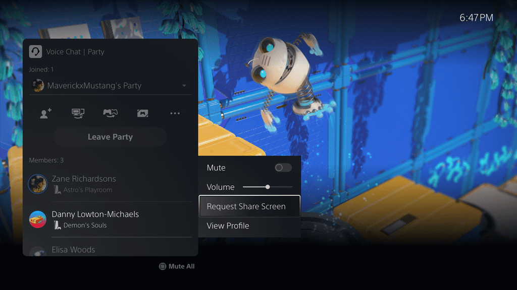 - À présent, vous pouvez demander aux membres d’une Party de lancer le Partage d’écran pour regarder leur gameplay. Accédez à la carte de chat vocal, sélectionnez le membre de la Party auquel vous souhaitez envoyer une demande, puis sélectionnez [Demander le partage d’écran].