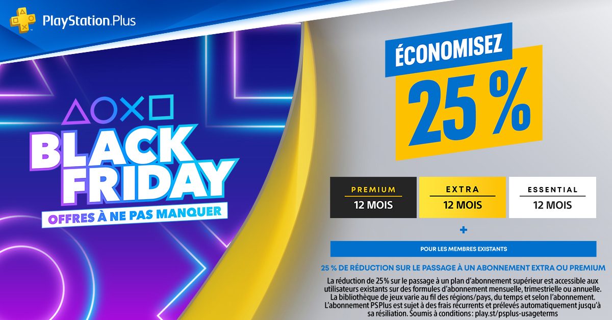 Pendant toute la durée des promos du Black Friday, bénéficiez d’une remise de 25 % sur les trois plans d’abonnement à PlayStation Plus de 12 mois** : PlayStation Plus Essential, Extra et Premium. Les membres PlayStation Plus Essential actuels bénéficient eux d’une réduction de 25 % lorsqu’ils mettent leur abonnement à niveau vers PlayStation Plus Premium ou Extra. Connectez-vous pour voir vos offres Black Friday.