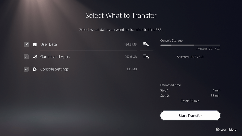 - Transfert de données entre consoles PS5. Vous pouvez désormais transférer facilement les données de votre console PS5, comme les jeux, les données sauvegardées, les profils utilisateur, les captures d’écran et les vidéos vers une autre console PS5 en passant par un réseau Wi-Fi ou un câble LAN. Les données peuvent être transférées lors de la configuration initiale de la console PS5 ou plus tard, à partir du menu des paramètres. Ce processus ne supprime ou ne modifie pas les données de votre console PS5 d’origine.