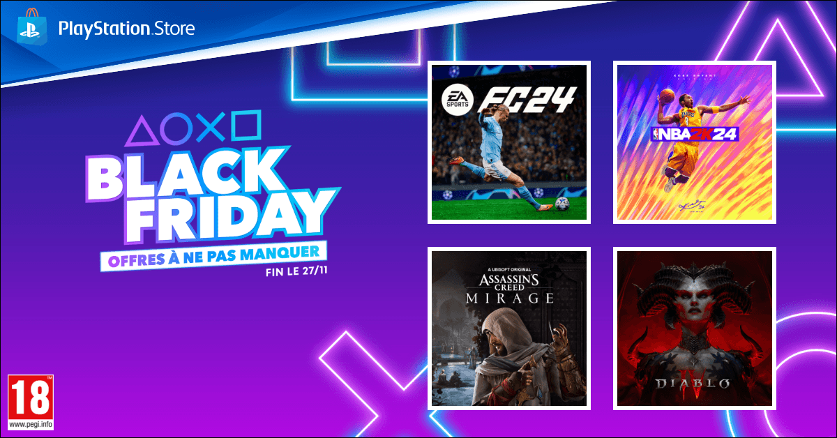 De grosses offres se dirigent également vers le PlayStation Store pour le Black Friday. Du 17 au 27 novembre, profitez d’offres sur des jeux PS4 et PS5, dont des titres immanquables tels que EA Sports FC 24, NBA 2K24, Assassin’s Creed Mirage, et bien plus encore. N’hésitez pas à vous rendre sur le PlayStation Store lorsque les offres commenceront pour voir la sélection complète ainsi que vos offres locales.