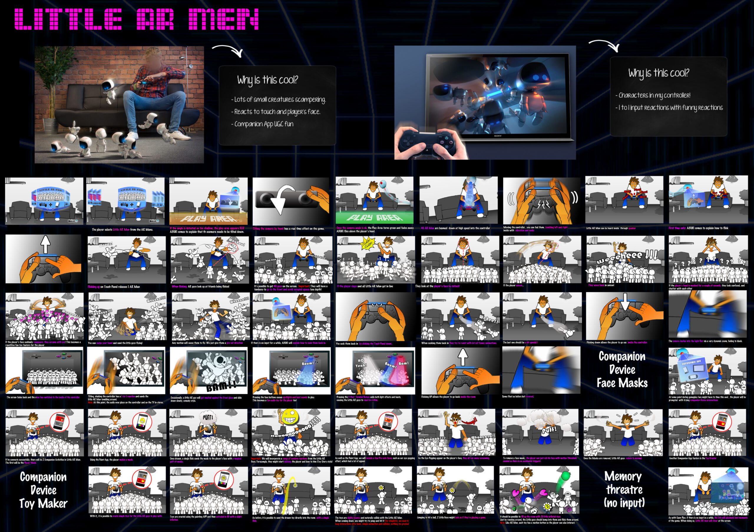 Le tout premier concept d’Astro Bot est né du désir de Team Asobi de faire des expériences sur la connexion entre la manette DualShock 4 et la caméra PS4 dans une démo dont le titre provisoire était Little AR (RA : Réalité Augmentée) Men. Les personnages principaux étaient de tout petits robots avec lesquels vous pouviez interagir sur le sol de votre salon.