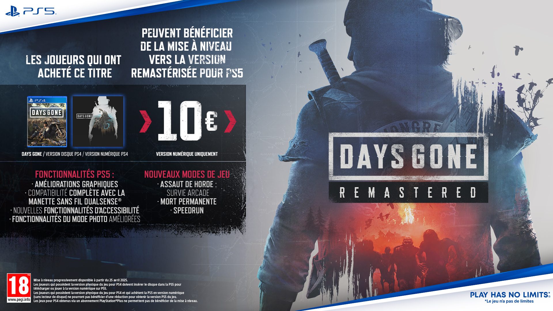 Days Gone Remastered débarque sur PlayStation 5 le 25 avril 2025. Plongez dans la version définitive de Days Gone avec de nouveaux modes, des fonctionnalités inédites et des améliorations techniques permettant d’exploiter au maximum les capacités des consoles PS5 et PS5 Pro. Parmi les nouveautés, vous trouverez le mode Assaut de horde, le mode Mort permanente et le mode Speedrun, qui feront aussi leurs débuts sur PC grâce au DLC « Broken Road ». Que ce soit votre premier contact avec Days Gone ou que vous ayez déjà enfourché la fameuse moto de drifter, vous aurez plein de contenu et de nouveautés à explorer. Si ce n’est pas déjà fait, jetez donc un œil à notre annonce de Days Gone Remastered sur le blog pour en savoir plus sur le nouveau contenu et les nouvelles fonctionnalités.